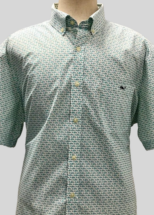 Camisa de botones Vineyard Vines 🐳 Performance color blanco con diseño de peces en color azul Talla XXL Entalle Clásico