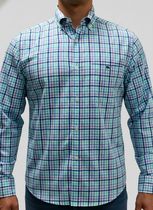 Camisa de botones Vineyard Vines 🐳 con patrón de cuadros en color turquesa, lila y azul Talla S Entalle Slim Fit