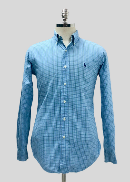 Camisa Polo Ralph Lauren 🏇🏼 color celeste con cuadros en color negro y verde Talla S Entalle Custom Fit