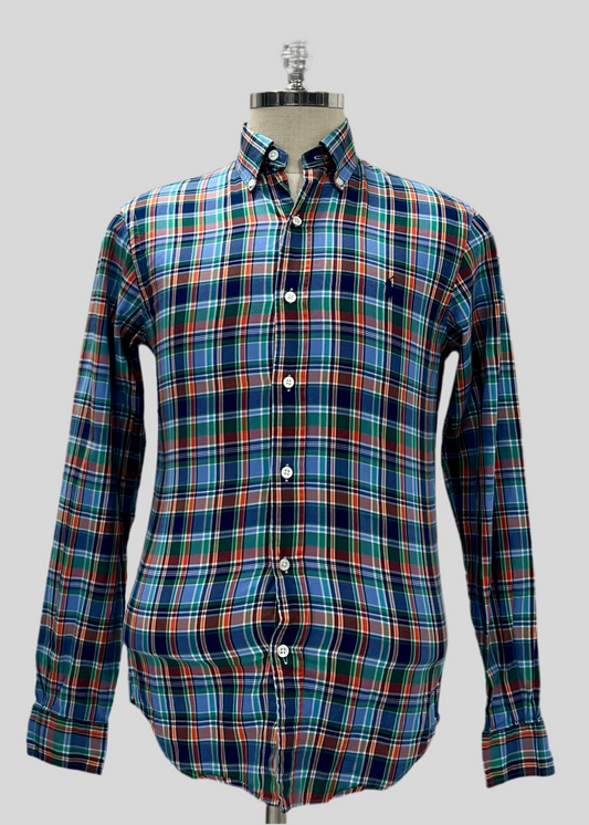 Camisa Polo Ralph Lauren 🏇🏼 con patrón de cuadros en color celeste, azul, verde y naranja Talla S entalle Slim Fit