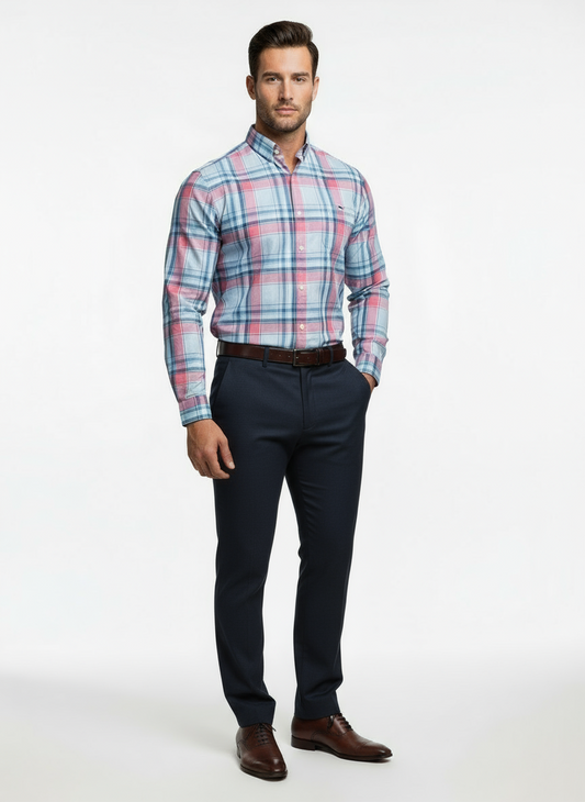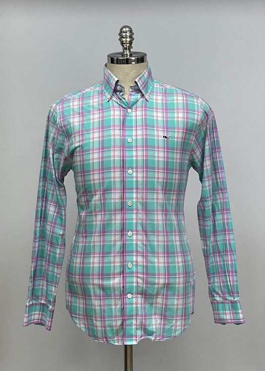Camisa Vineyard Vines 🐳 color celeste con cuadros en color rosado y azul Talla S entalle Slim Fit
