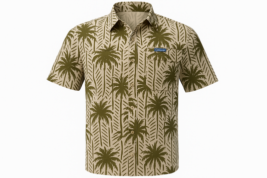 Camisa Columbia 🔹Color Kaki con diseño de palmeras Manga corta Talla S