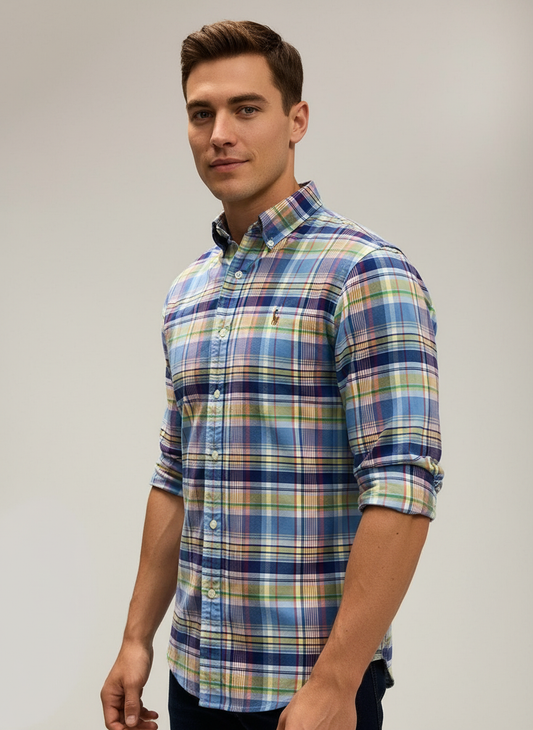 Camisa de botones Polo Ralph Lauren 🏇🏼 Oxford de cuadros tartán amarillo, celeste, azul y blanco Talla S Entalle Regular