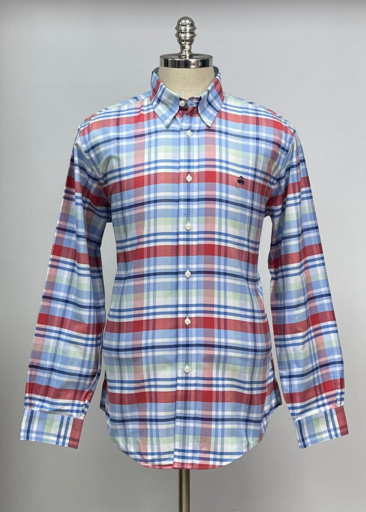 Camisa Brooks Brothers 🐑 con patrón de cuadros tartán en color celeste, rojo, verde claro y blanco Talla L Entalle Regular