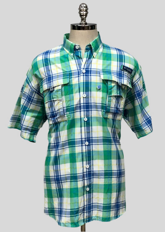 Camisa Columbia 🔹 Color blanco con patrón de cuadros en verde y azul Manga corta Talla M