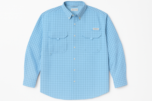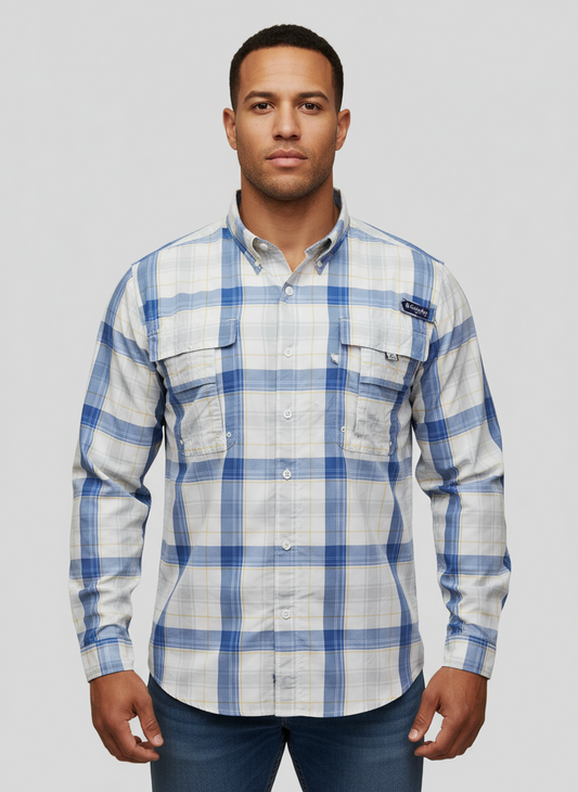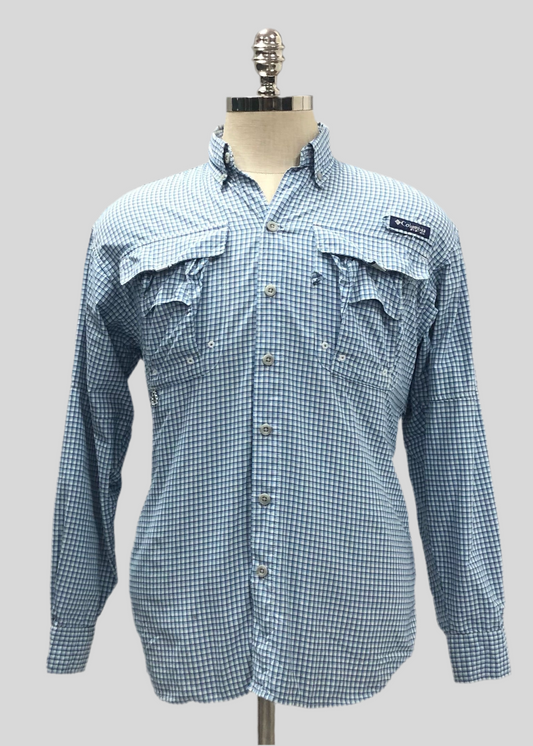 Camisa Columbia 🔹 Modelo Super Bonehead con patrón de cuadros en celeste y blanco Manga larga Talla L (ver descripción)