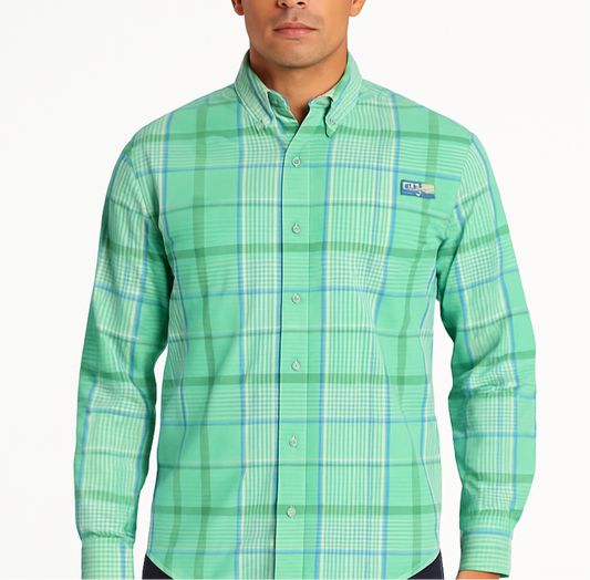 Camisa Columbia 🔹 Modelo Super Bonehead con patrón de cuadros en celeste, verde y blanco Manga larga Talla S