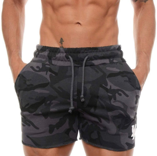 Shorts de gimnasio 🏋️♀️ YoungLA color Gris con diseño de camuflaje y logo en color Blanco Talla XL Entalle Slim Fit