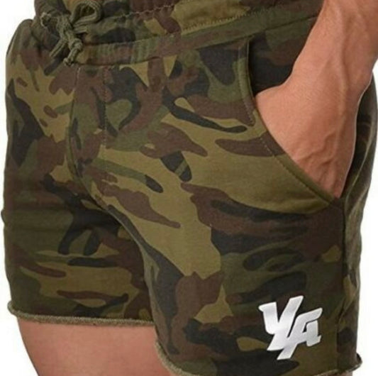 Shorts de gimnasio 🏋️♀️ YoungLA color verde oliva con diseño de camuflaje y logo en color Blanco Talla M Entalle Slim Fit