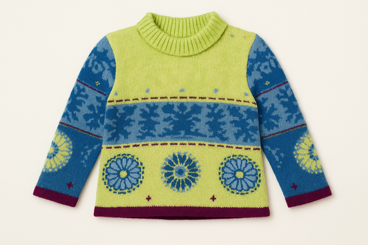 Sueter Jersey tejido de niña Marèse🌊 con cuello alto color verde con diseños en azul y magenta Talla 3