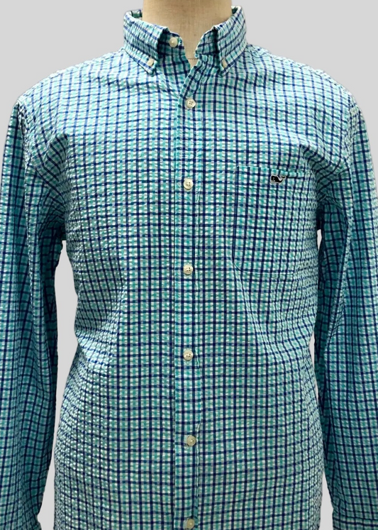 Camisa de botones Vineyard Vines 🐳 Seersucker color blanco de cuadros en color turquesa y azul Talla L Entalle Clásico
