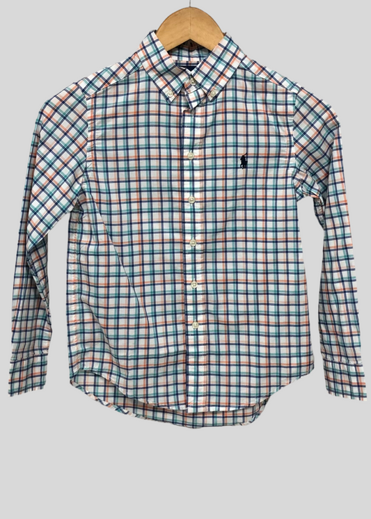 Camisa Polo Ralph Lauren 🏇🏼 con patron de cuadros en naranja, azul, verde y blanco Talla M (10-12) de niño Entalle Regular