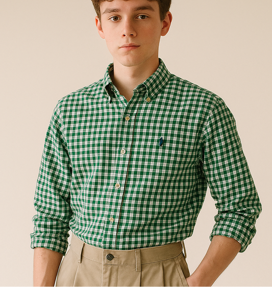 Camisa de niño Polo Ralph Lauren 🏇🏼 color blanco con patron de cuadros en color verde Talla XL Entalle Regular