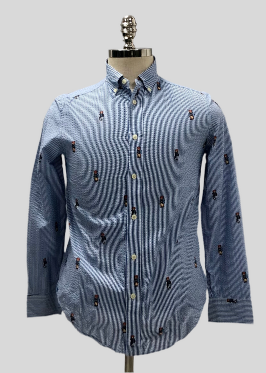 Camisa de niño Polo Ralph Lauren 🏇🏼 Seersucker con patron de rayas en azul y blanco con diseño de Polo Bear Talla L (14-16) Entalle Regular