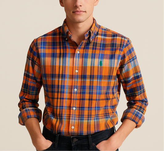 Camisa Polo Ralph Lauren 🏇🏼 color patron de cuadros en naranja, azul, amarillo y blanco Talla XL (18) de niño Entalle Regular