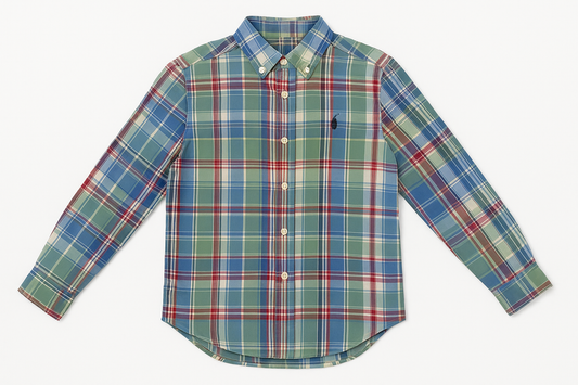 Camisa de niño Polo Ralph Lauren 🏇🏼 color blanco con patron de cuadros en celeste, aul, rojo y verde Talla L (14-16) Entalle Regular