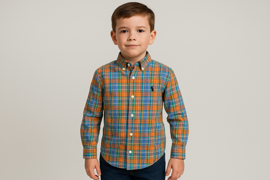 Camisa de niño Polo Ralph Lauren 🏇🏼 con patron de cuadros en celeste, naranja y verde Talla S (7) Entalle Regular