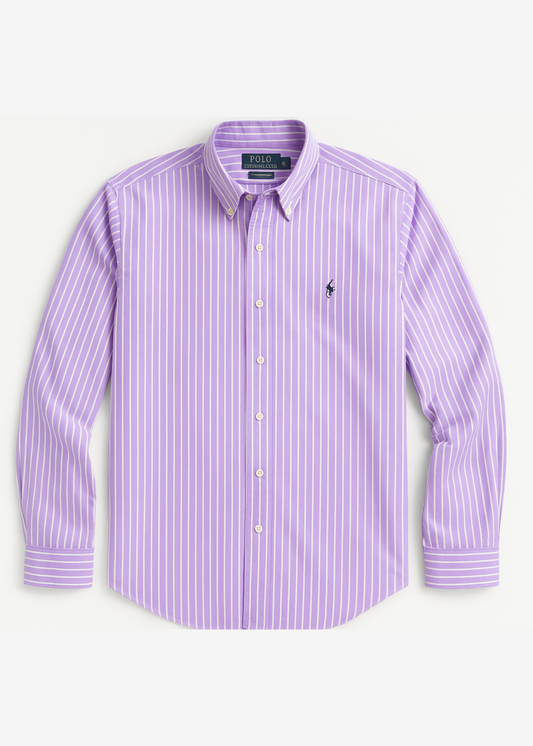 Camisa Polo Ralph Lauren 🏇🏼 con patron de rayas en color morado, azul navy y blanco Talla XL Entalle Regular