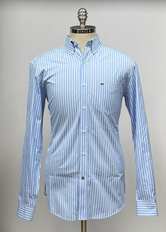 Camisa de botones Lacoste 🐊 color celeste con patron de rayas en blanco Talla L Entalle Regular