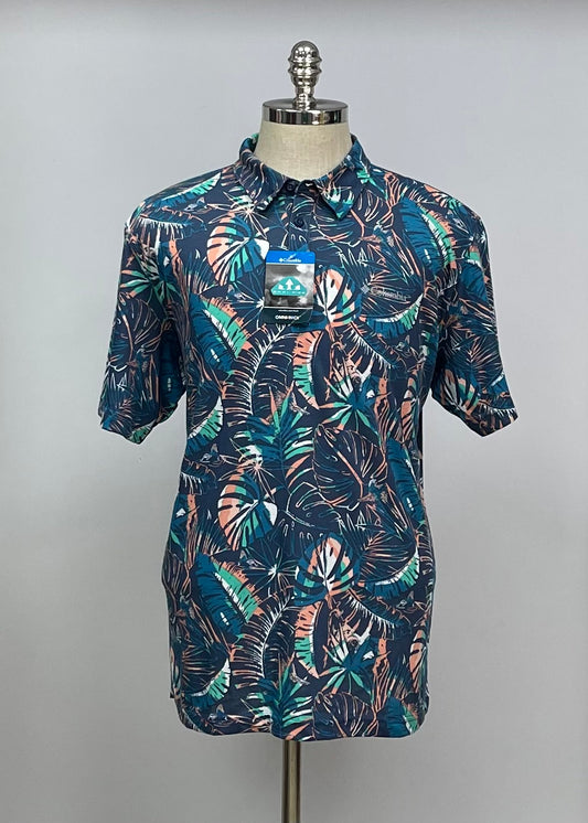 Camisa Columbia 🔹Color azul oscuro con diseño de palmeras en blanco y naranja manga corta Talla XL