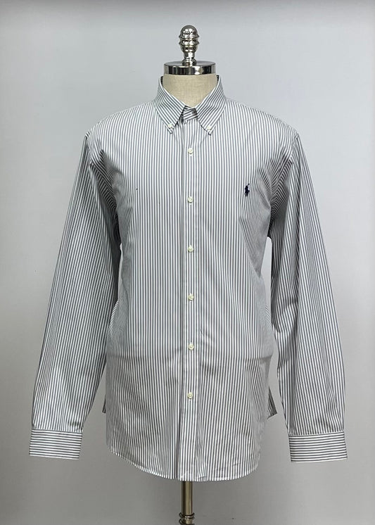 Camisa Polo Ralph Lauren 🏇🏼 color blanco con patrón de rayas en gris oscuro Talla XL Entalle Clásico