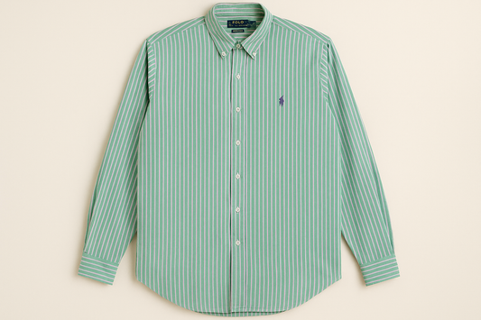Camisa Polo Ralph Lauren 🏇🏼 con patron de finas rayas en color verde oscuro y blanco Talla XXL Entalle Regular