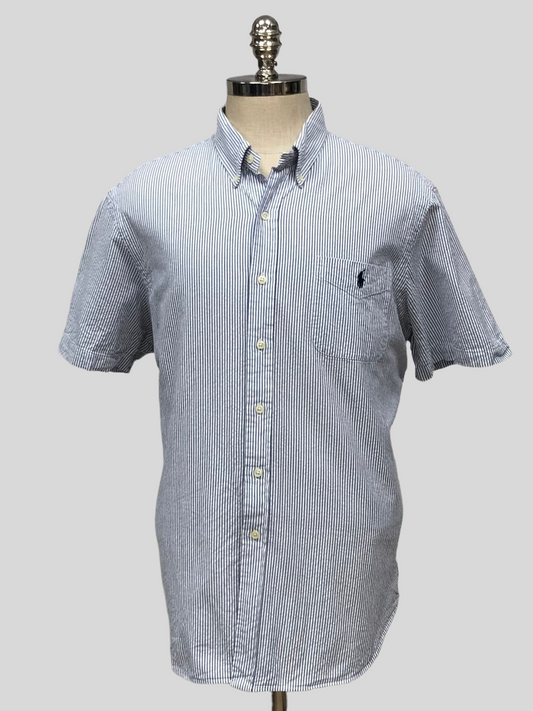 Camisa Polo Ralph Lauren 🏇🏼 Color blanco con patrón de rayas en azul Seersucker Talla XL Entalle Regular