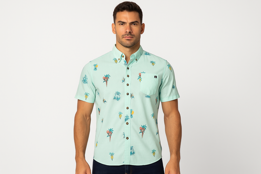 Camisa de botones Billabong 🏄🏽♂️ color celeste con diseño de palmeras Talla M Entalle Regular
