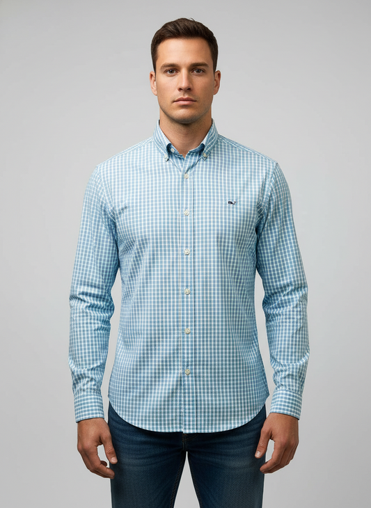 Camisa de botones Vineyard Vines 🐳 Performance de cuadros en color celeste y blanco Talla S Entalle Regular
