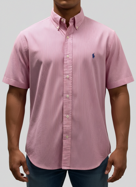 Camisa de botones Polo Ralph Lauren 🏇🏼 color blanco con patron de rayas finas en color rosado Talla L Entalle Clasico