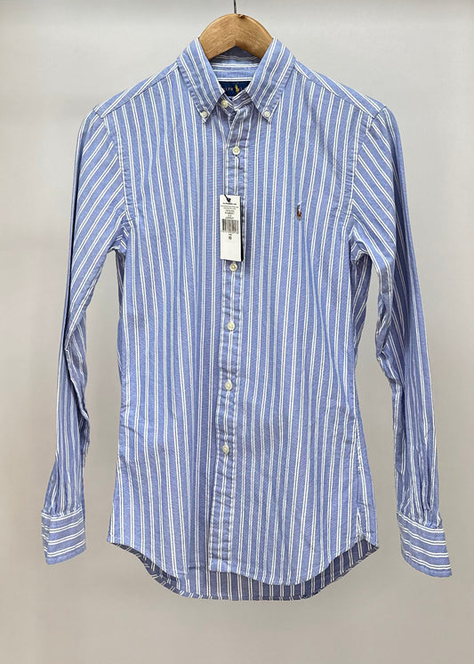 Camisa Polo Ralph Lauren 🏇🏼 Oxford color celeste con rayas en color blanco Talla XS Entalle Slim Fit
