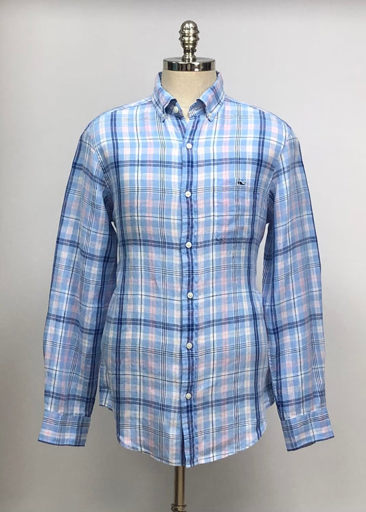Camisa de botones Vineyard Vines 🐳 De Lino con patrón de cuadros en azul, rosado y blanco Talla M Entalle Clásico