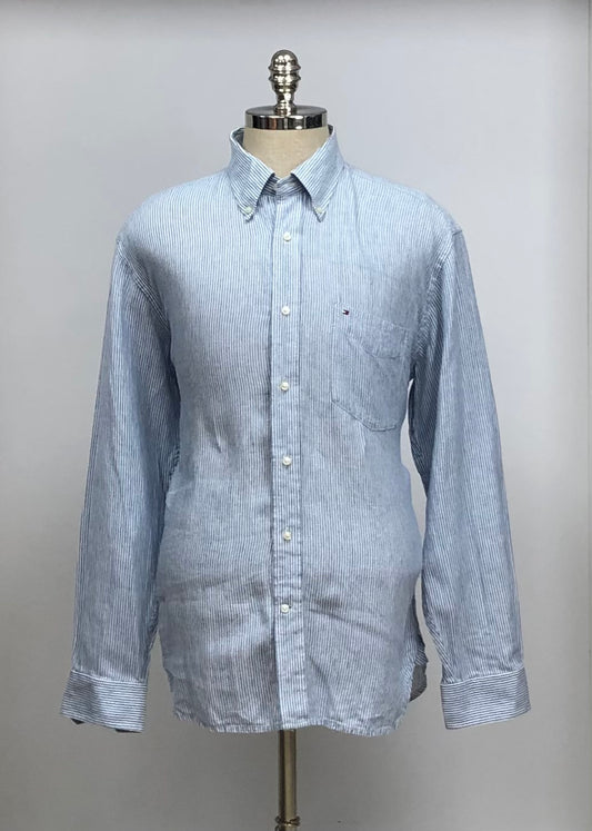 Camisa de botones Tommy Hilfiger 🇺🇸 de lino con rayas finas en color celeste y blanco Talla L Entalle Regular