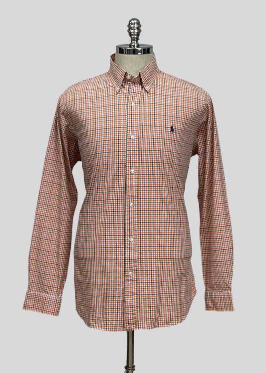 Camisa Polo Ralph Lauren 🏇🏼 color blanco con patrón de cuadros naranja, verde y azul Talla L Entalle Clásico