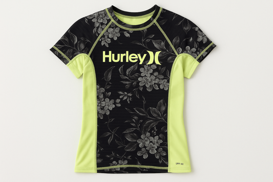Camiseta de baño Hurley 🏄🏽♂️ color negro y verde claro con diseño floral Talla XL de mujer
