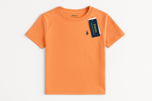 Camiseta cuello redondo de niño Ralph Lauren 🏇🏼 color naranja y logo en color azul navy Talla S (8) Entalle Regular