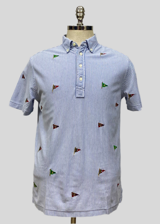 Camiseta Polo Ralph Lauren 🏇🏼 (Knit Oxford) color blanco de rayas en celeste y diseño de banderas Talla M Entalle Regular
