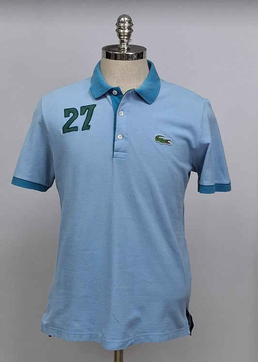Camiseta Polo Lacoste 🐊 color celeste y diseño en cuello y manga color azul Talla L Entalle Regular