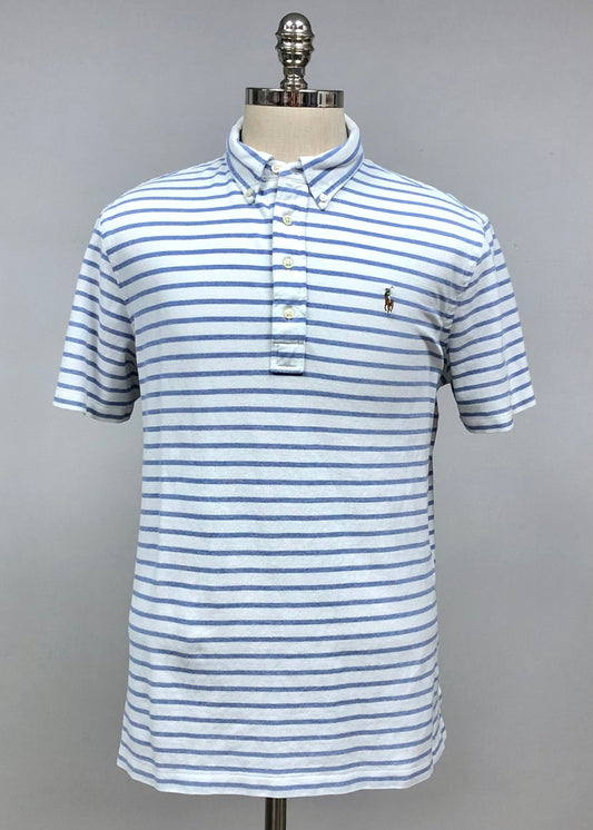 Camiseta Polo Ralph Lauren 🏇🏼 (Knit Oxford) color blanco con patrón del rayas en celeste Talla L Entalle Regular