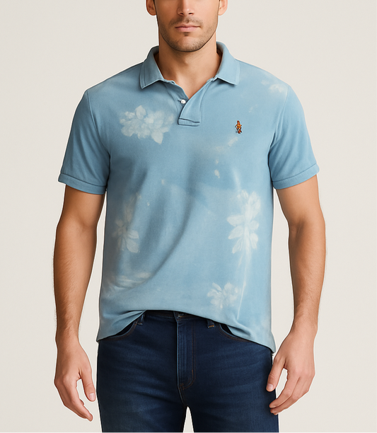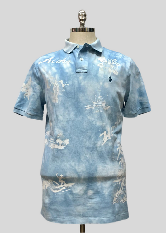 Camiseta Polo Ralph Lauren 🏇🏼 color celeste con diseño de hawaiano en color blanco Talla M Entalle Clásico