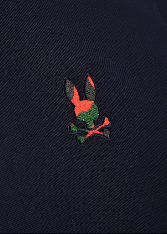 Camiseta Polo Psycho Bunny 🐰 Pique en color azul navy con diseño de cuello en blanco y verde Talla M Entalle Regular