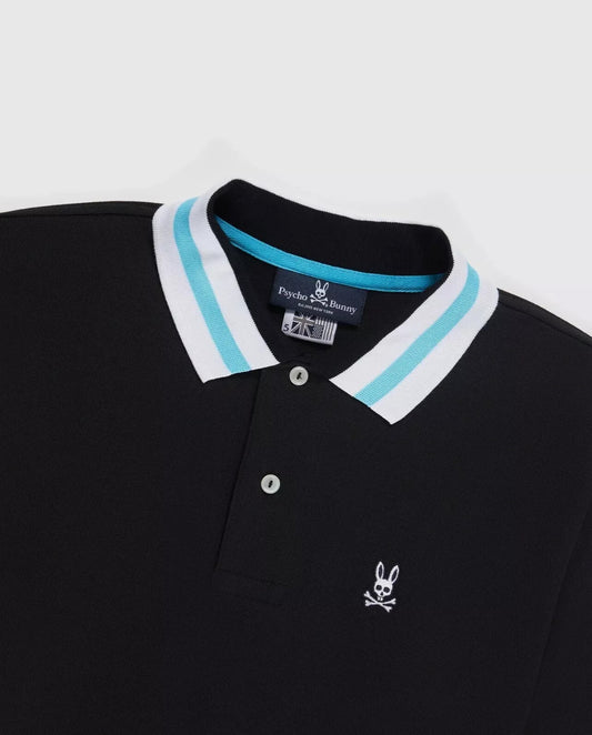 Camiseta Polo Psycho Bunny 🐰 Pique en color negro con diseño de cuello en blanco y celeste Talla L Entalle Regular