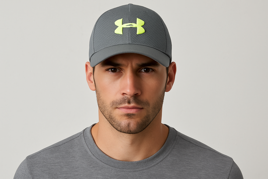 Gorra Under Armour 🏋🏽 color gris y logotipo en color verde intenso