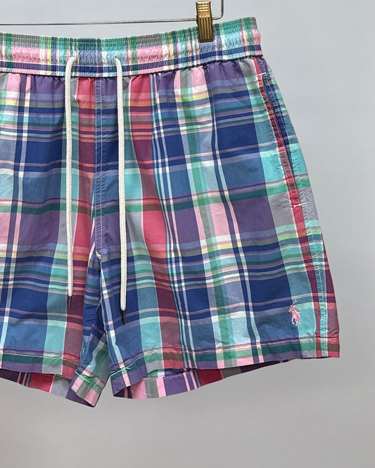 Short de baño Polo Ralph Lauren 🏇🏼de cuadros en color azul, verde y rosado con logo bordado en color rosado talla M (ver descripción)