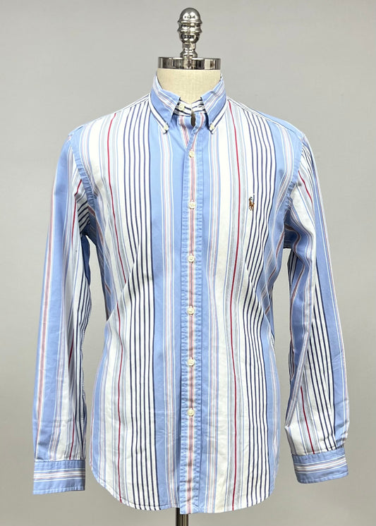 Camisa Polo Ralph Lauren 🏇🏼 color Blanco con patron de rayas en celeste, azul y rojo Talla M Entalle Clásico (ver descripción)