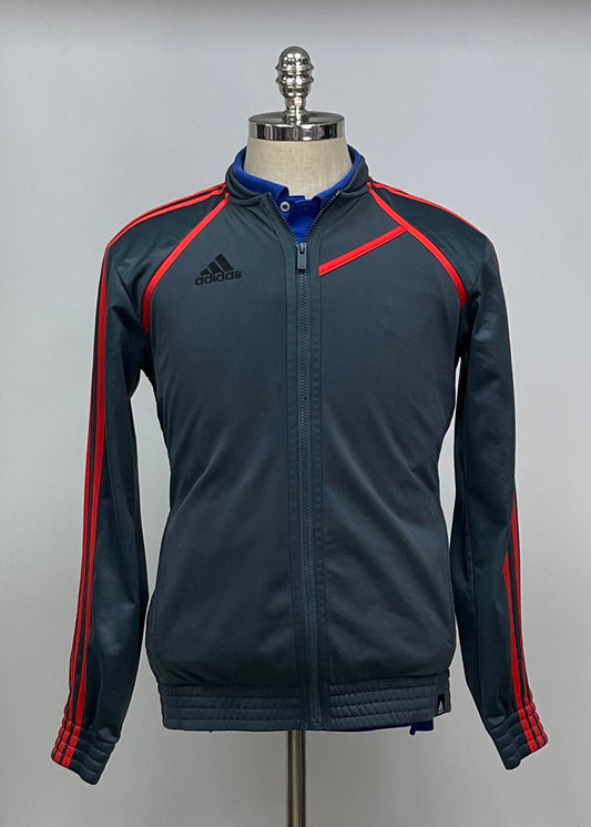 Jacket Adidas 🏃🏻♂️ color gris oscuro con rayas en naranja con zíper completo y logo en color negro Talla M (ver descripción)