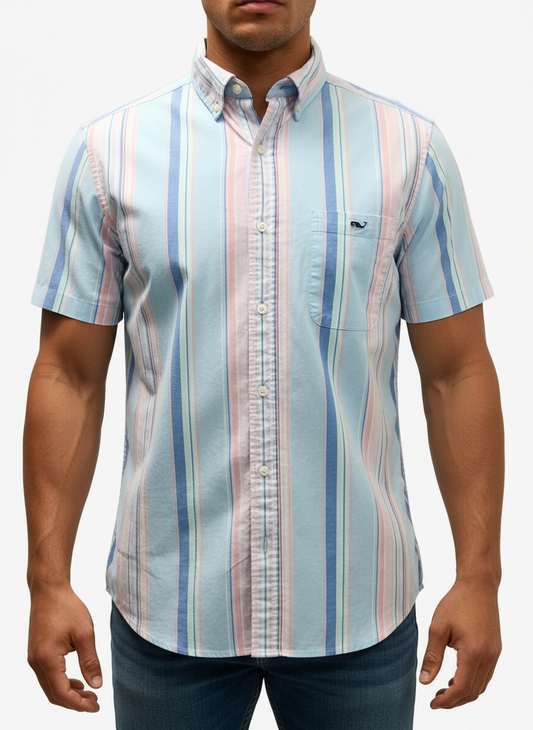 Camisa de botones Vineyard Vines 🐳 De rayas en color Celeste, azul y rosado manga corta Talla M Entalle Clásico