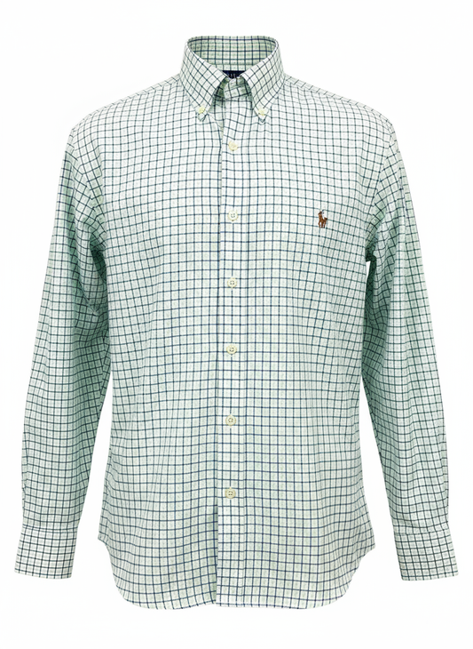 Camisa Polo Ralph Lauren 🏇🏼 color blanco con patron de cuadros azul navy y verde Talla M Entalle Regular