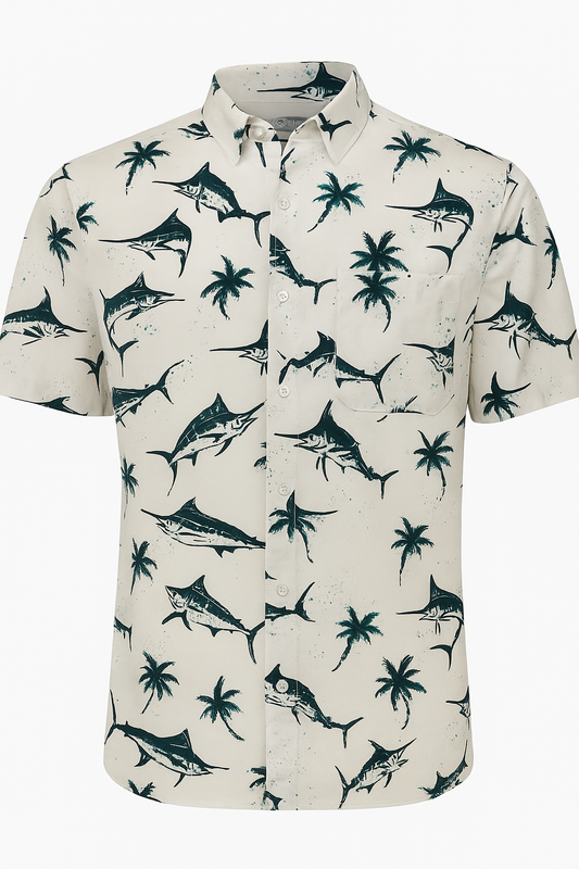 Camisa Columbia 🔹Color blanco con diseño de pez espada en azul y verde Talla XXL
