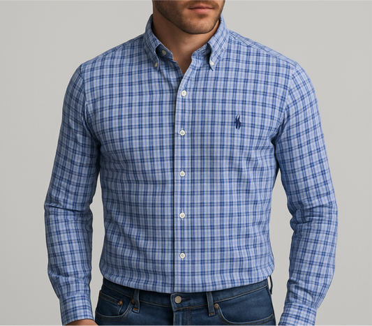 Camisa Polo Ralph Lauren 🏇🏼 color blanco con patrón de cuadros azul y celeste Talla S Entalle Slim Fit